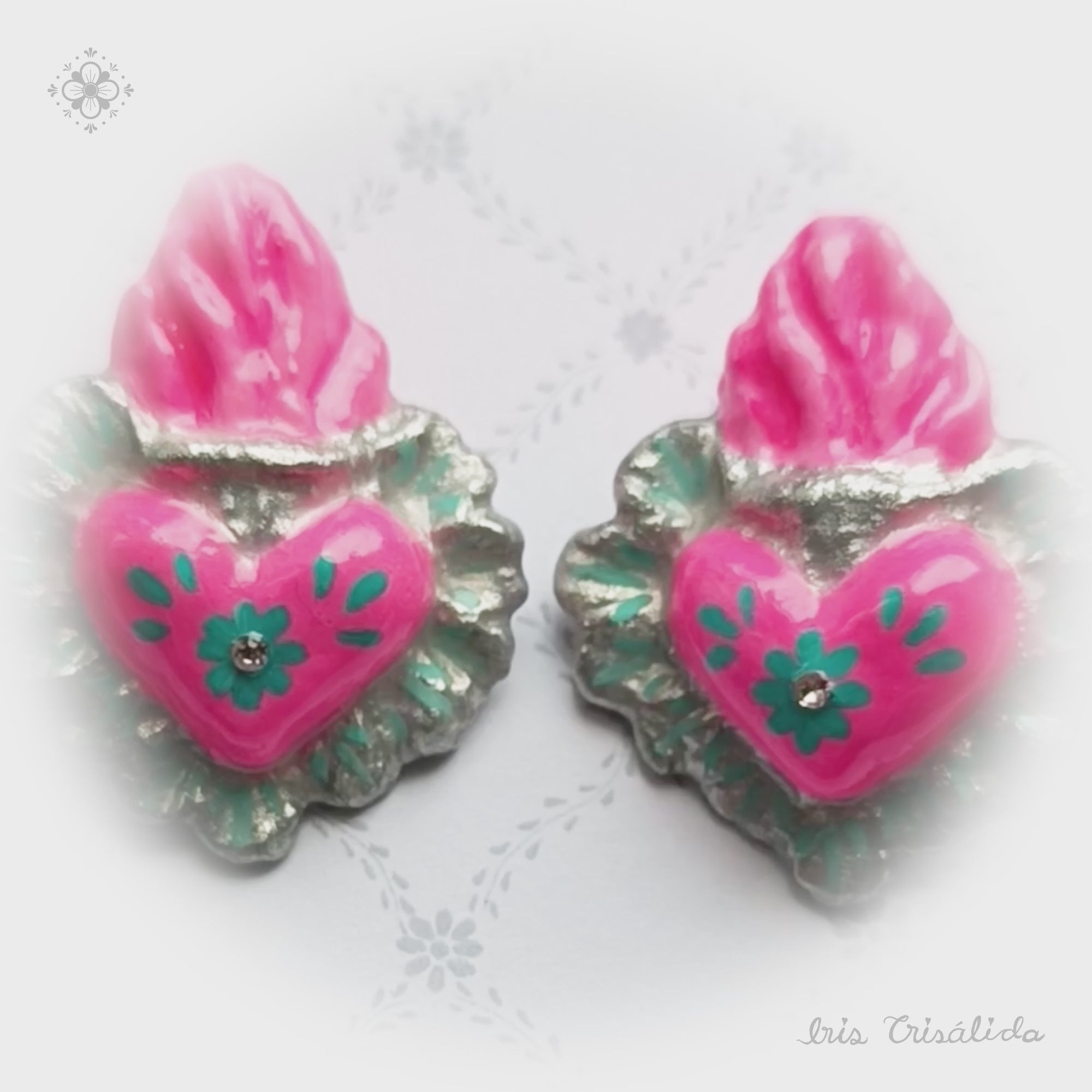 These aureal hearts will glow with the very luminous grace of your soul. Inspired by Catholic iconography, these luminescent heart papier-mâché earrings are designed to catch the eye.