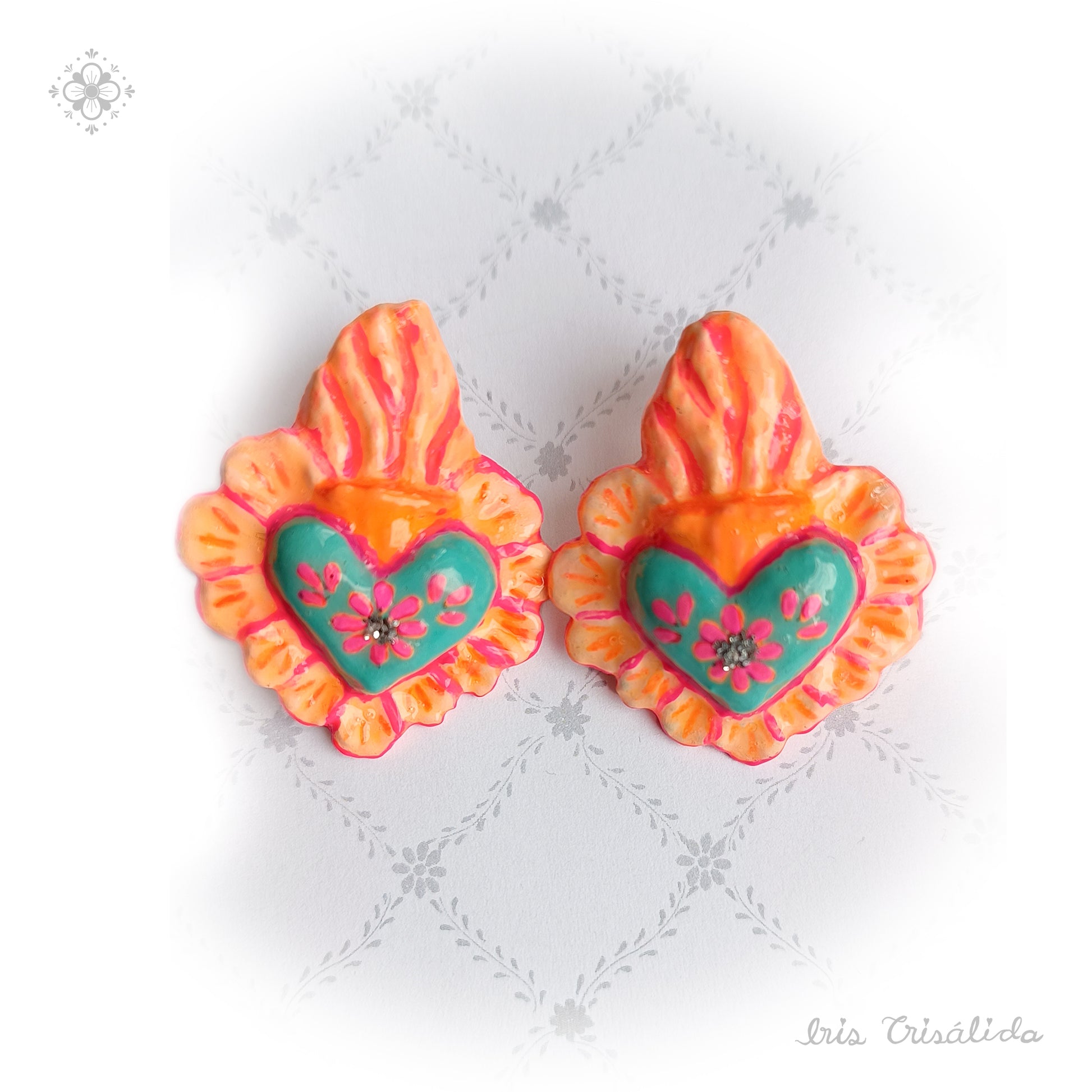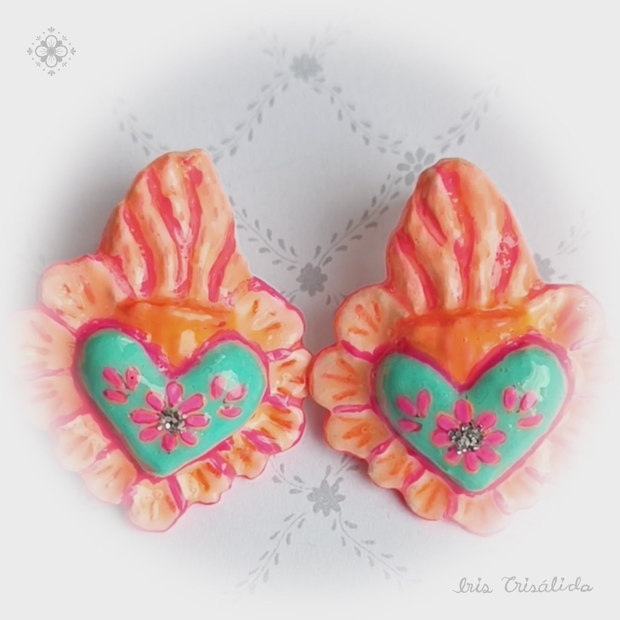 These aureal hearts will glow with the very luminous grace of your soul. Inspired by Catholic iconography, these luminescent heart papier-mâché earrings are designed to catch the eye.