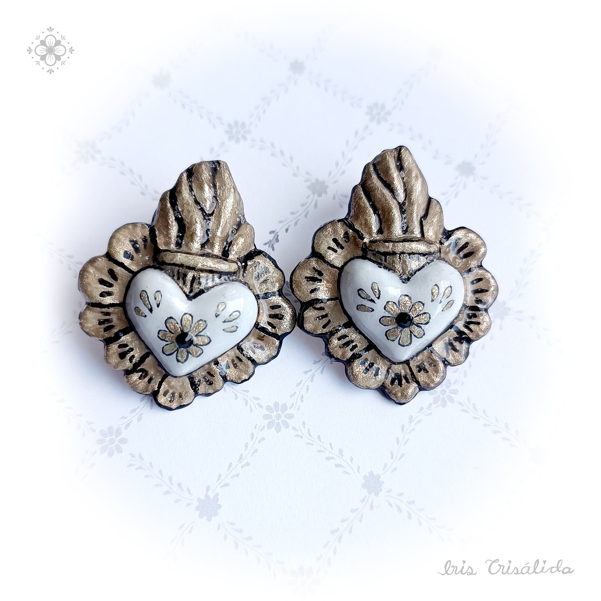 These aureal hearts will glow with the very luminous grace of your soul. Inspired by Catholic iconography, these luminescent heart papier-mâché earrings are designed to catch the eye.