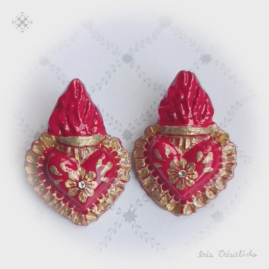 Hearts aflame that will never turn off. These papier-mâché earrings are designed to catch the eye.