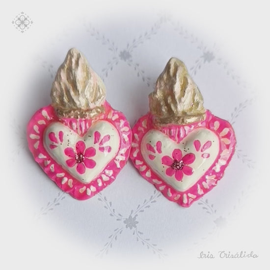 Hearts aflame that will never turn off. These papier-mâché earrings are designed to catch the eye.