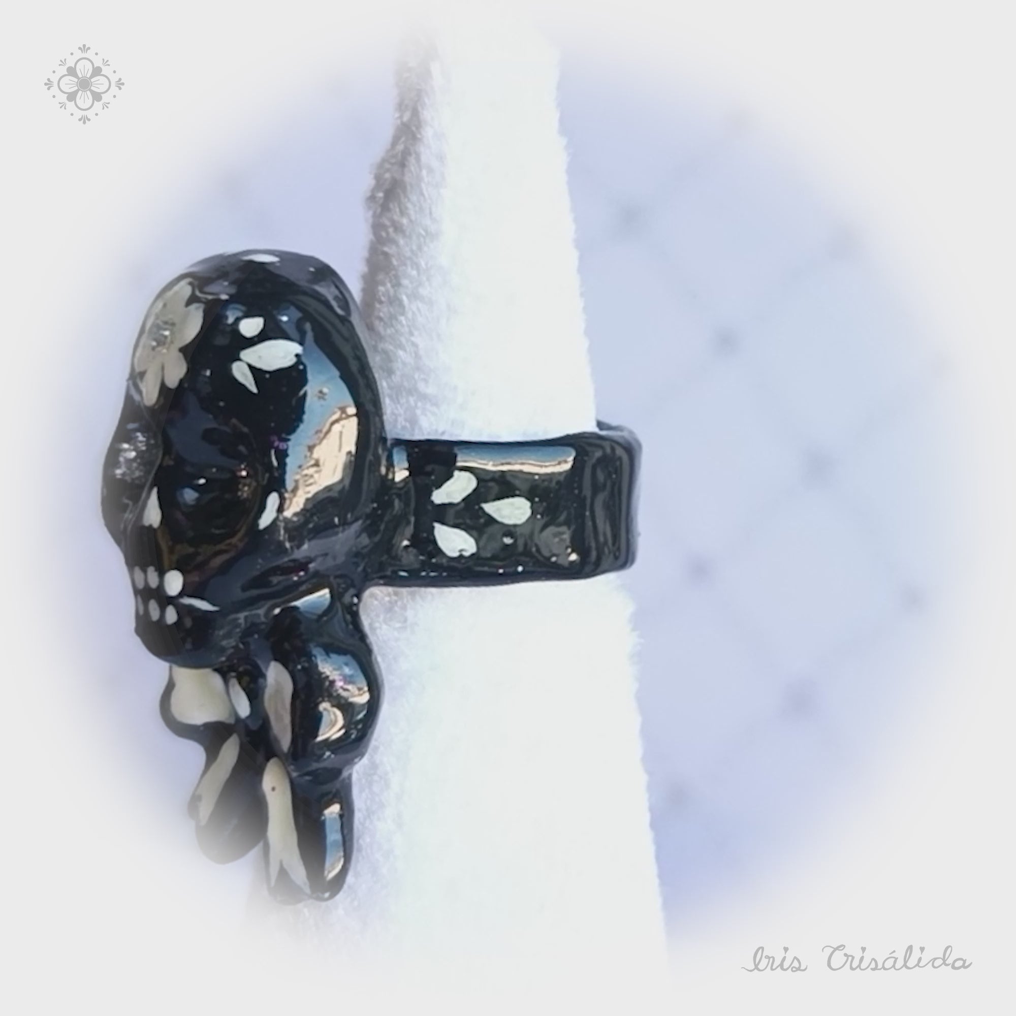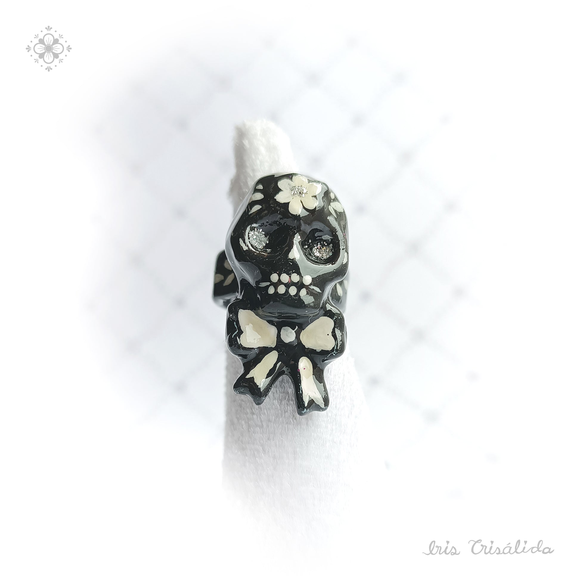 This ring features a dear joyfull skull, made to adorn your fingers. Papier-mâché ring designed to catch the eye.